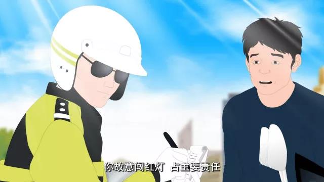 騎著摩托車(chē)的交警過(guò)來(lái)處理事故。交警對(duì)坐在地上的小強(qiáng)說(shuō):“你故意闖紅燈,要承擔(dān)本起事故的主要責(zé)任。”對(duì)轎車(chē)車(chē)主說(shuō):“你經(jīng)過(guò)路口車(chē)速?zèng)]有放緩,要承擔(dān)次要責(zé)任!”